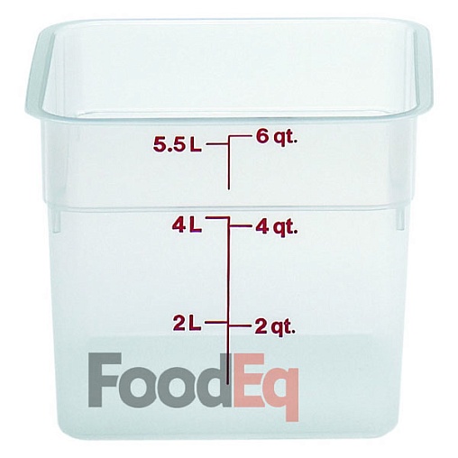 Емкость для хранения пищевых продуктов Cambro 6SFSPP изготовлена из прозрачного пластика с нанесением мерной градуировки. Пластик является ударопрочным и выдерживает воздействие температуры в диапазоне -40°С ... +70°С. Объем емкости составляет 5,7 литра.